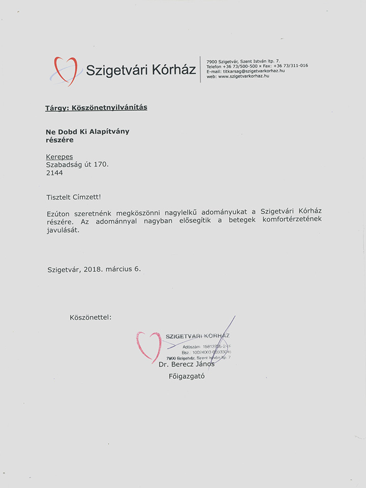 Szigetvári Kórház köszönőlevél