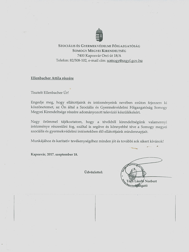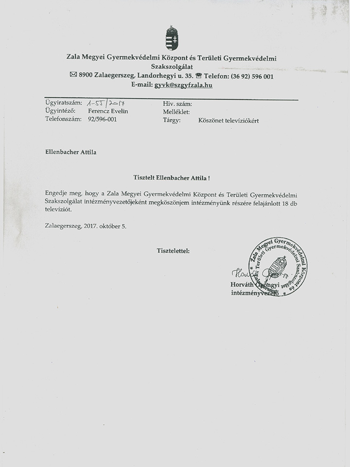 Zala-megyei Gyermekvédelem Köszönőlevél