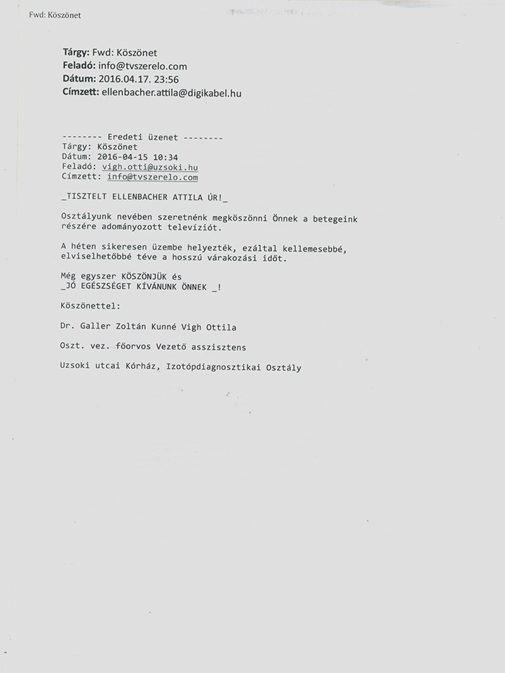 Szent László Kórház hospice részleg antenna kiépítés köszönő levél.