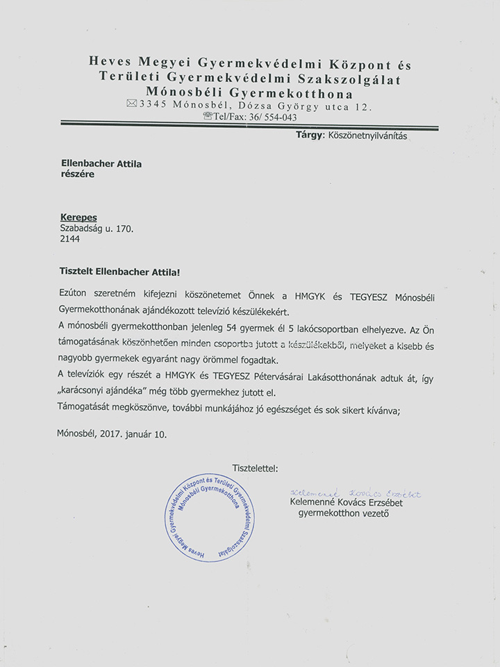 Heves-megyei Gyermekvédelmi Központ köszönőlevél