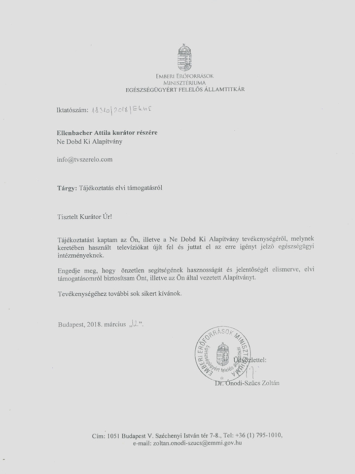 Dr. Ónodi-Szűcs Zoltán Egészségügyi Államtitkár Köszönőlevél