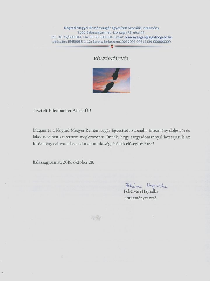Nógrád Megyei Reménysugár Egyesített Szociális Intézmény Köszönőlevél
