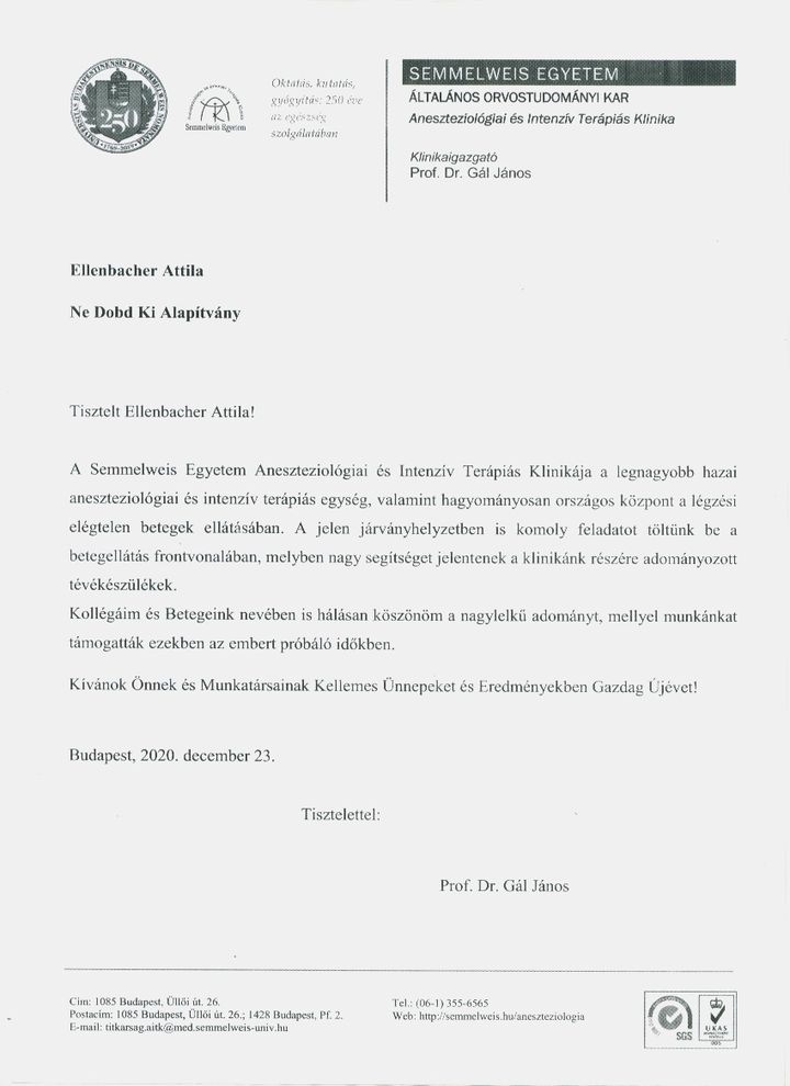 Semmelweis Egyetem Köszönőlevél
