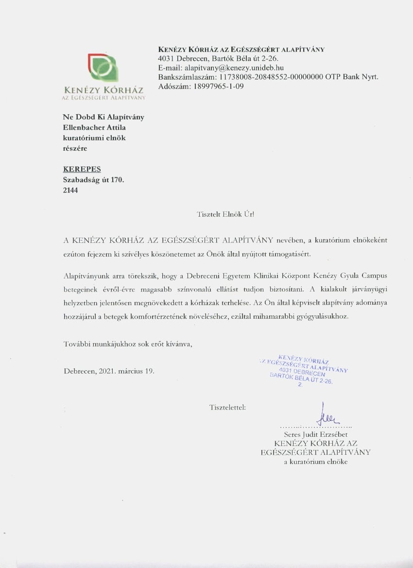 Kenézy Kórház köszönőlevél