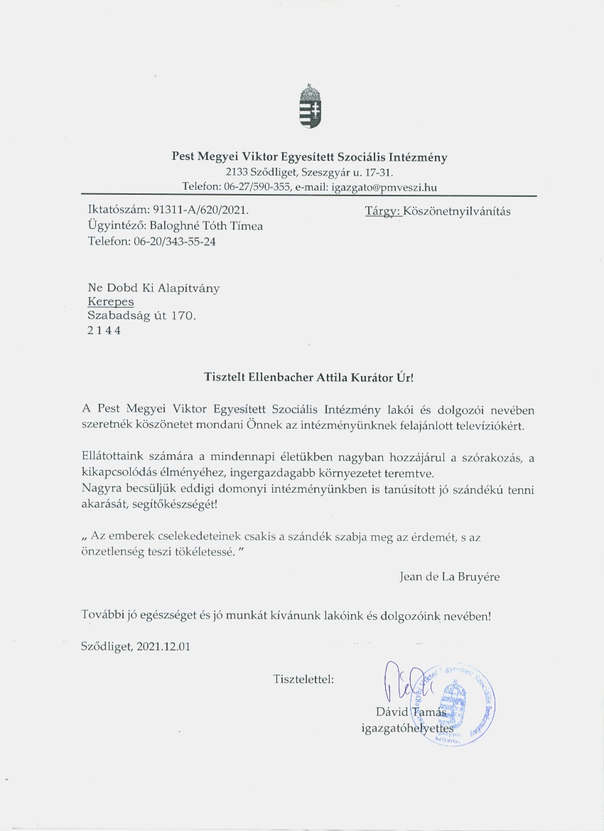 Károlyi István gyermekközpont köszönőlevél, Fót